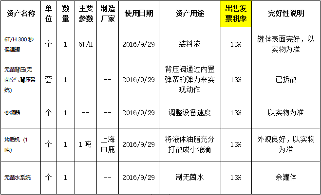 受委托,我公司將于2021年11月25日下午10時(shí)在金拍網(wǎng)平臺(tái)https://www.jinpaiwang.com.cn以網(wǎng)絡(luò)競(jìng)價(jià)的方式公開(kāi)處置保溫罐、變頻器、均質(zhì)機(jī)、無(wú)菌水系統(tǒng) 等一批設(shè)備,設(shè)備未裝箱,完好。
